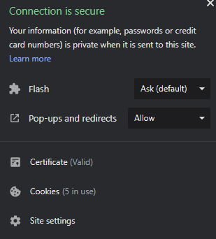 주소 표시 줄에 url 왼쪽에 있는 자물쇠 (보안 연결을 사용하지 않는다면 i 모양 아이콘)을 클릭하시면 위와 같은 창이 뜹니다.