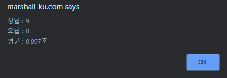 문제를 풀지 않고 취소를 누르면 정답 수, 오답 수, 문제를 푸는데 평균적으로 걸린 시간이 출력됩니다.