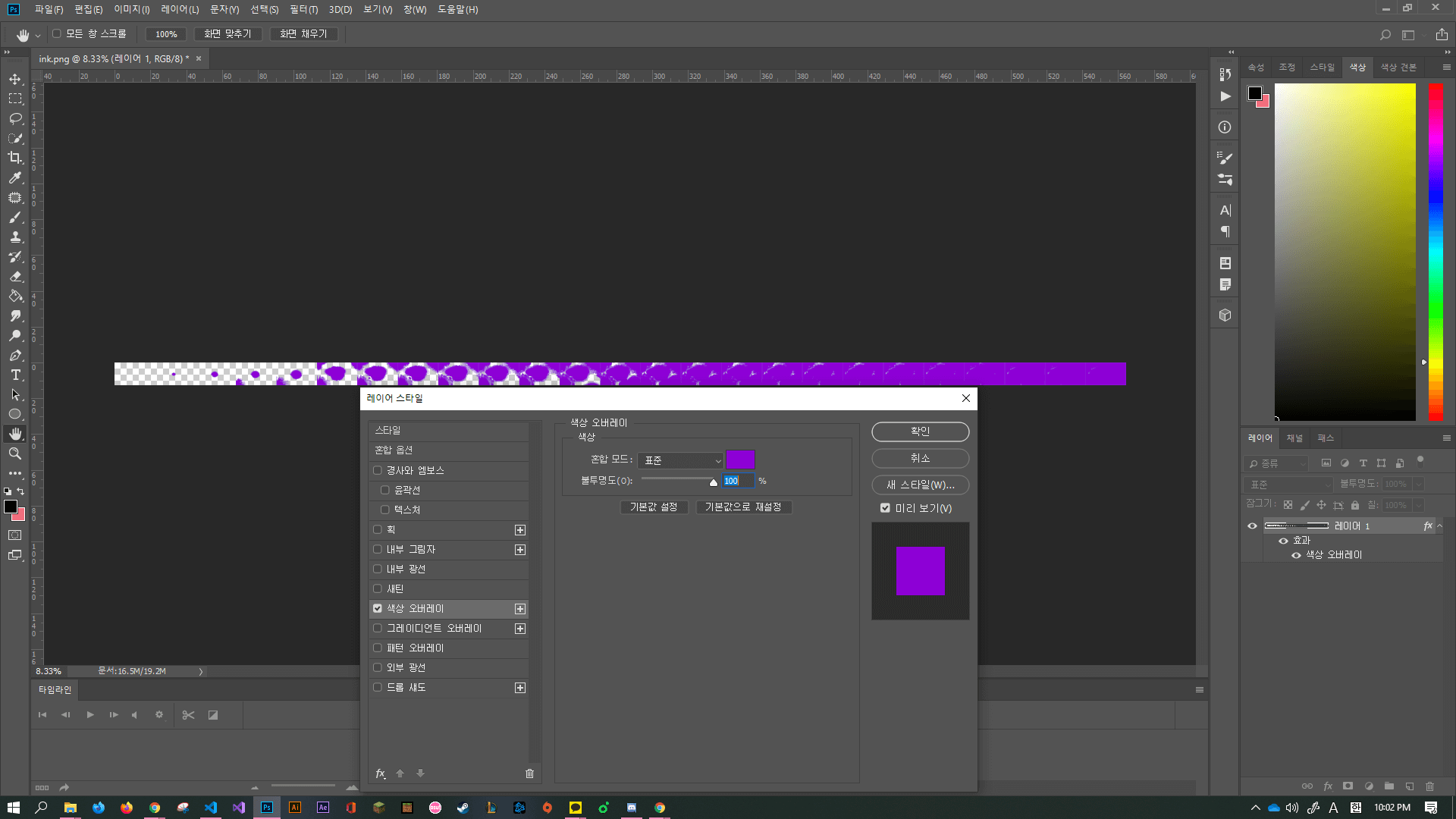 오른쪽 아래의 fx 버튼을 클릭하시고 색상 오버레이를 클릭하시면 위 화면이 뜹니다.