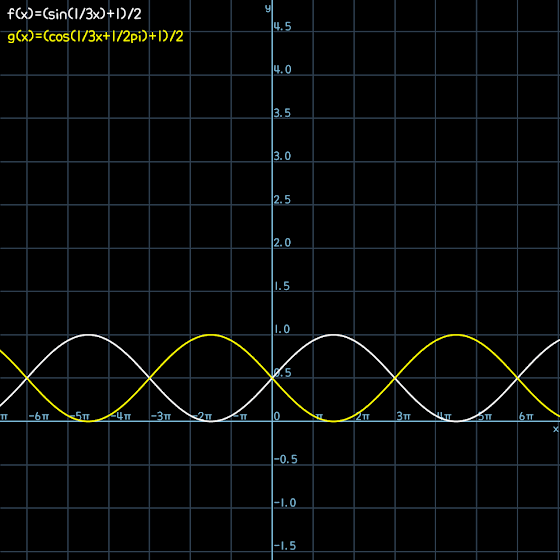 sin(x)와 cos(x)는 -1과 1 사이를 오가지만, opacity는 0 ~ 1 사이를 오가야 하니, sin 함수는 (sin(x) + 1) / 2 이렇게 이동해야 하고, sin(x)의 결과와 cos(x)의 결과가 정반대여야 하니, cos 함수는 (cos(x + 1/2*PI) + 1) / 2가 되어야 합니다.
