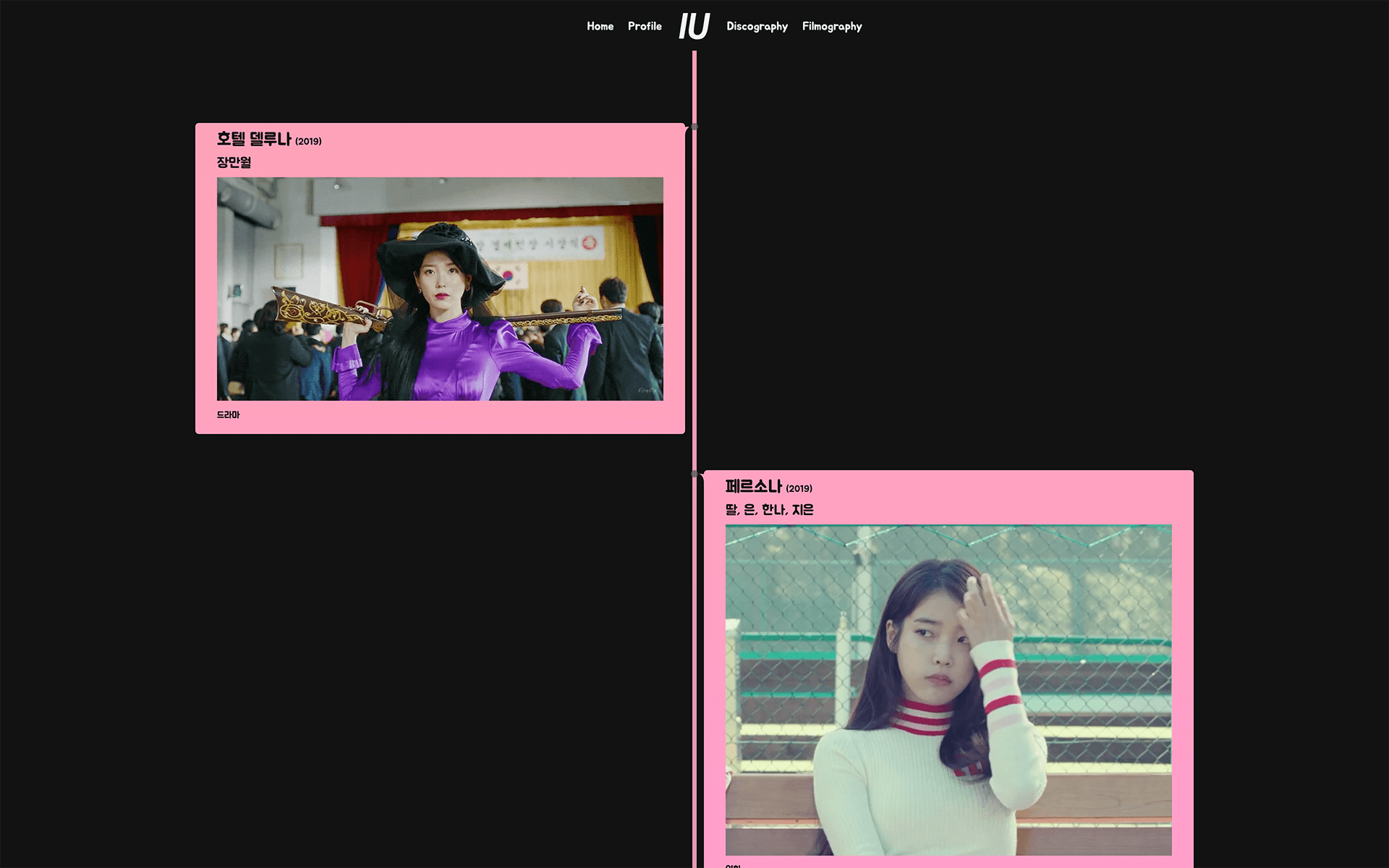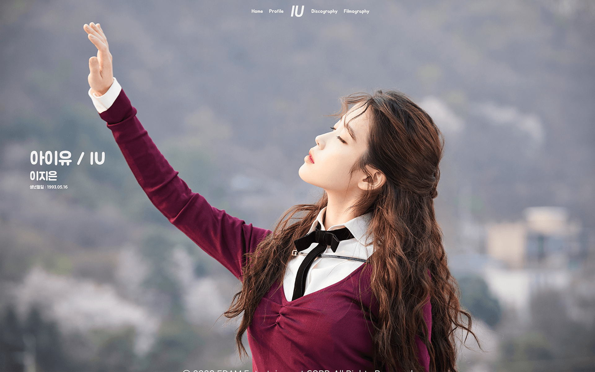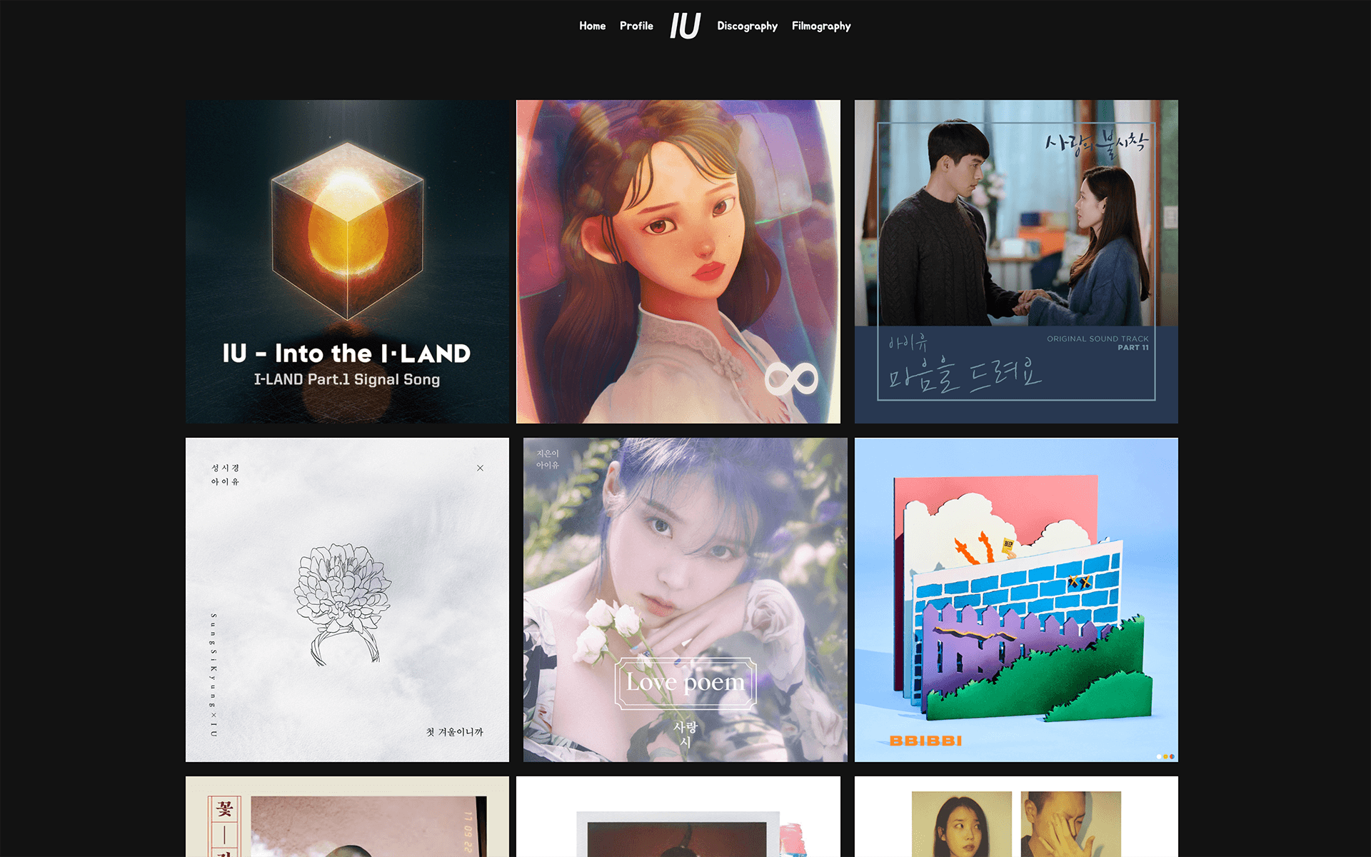 팬 페이지 만들 대상을 고민하다, 로고를 중심으로 Home, About / Discography, Filmography로 두 개씩 대칭을 맞출 수 있는 아이유를 선택했습니다.